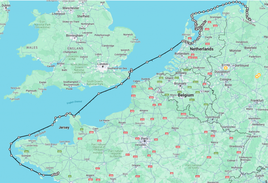 Donnerstag 16.5.24 Höhe Brighton UK. Nach der Passage von Ouessant und nach dem wir Brest und das Cap du Raz hinter uns liessen, fuhren wir die nordbretonische Küste entlang über Morlaix und Lannion. Das Ganze mal unter Segeln oder auch mit der Maschine, da der Wind immer wieder mal einschlief und uns nicht schnell genug nach Osten brachte. Inzwischen hatte sich aufgrund der anstrengenden Nachtfahrten und der recht ungewohnten Lebensweise eines Seemannes der Wunsch nach einer Hafen-Auszeit entwickelt. Aus dem Wetterbericht und Windy wußten wir, dass noch bevor wir Guernsey erreichen würden, ein Tief mit starken Südwinden durchziehen wird. In der Vorhersage wurde eine rasche Besserung der Wetterlage nach dem kurzen Durchzug versprochen. Die Schwierigkeiten, die die Häfen der Nordbretagne mit sich brachten, wie der Tidenhub und schwierige Anfahrten, waren uns aber zu kompliziert und so beabsichtigten wir nach dem Ende der Nachtfahrt am Montag in Guernsey einzulaufen. Der Hafen der Kanalinsel hat laut Beschreibung im Reeds eine einfache Zugängigkeit und steuerfreien Diesel zu bieten.