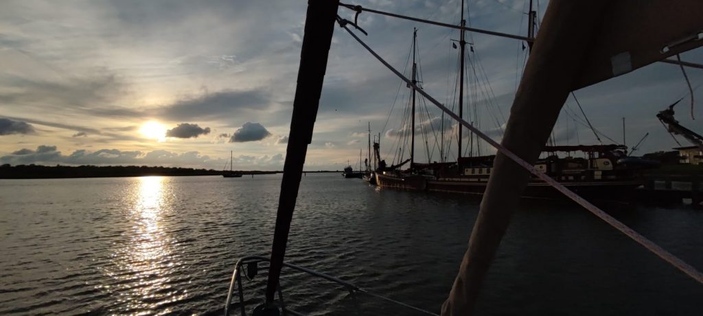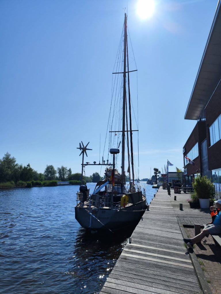 Am nächsten Tag geht es mit dem Sonnenaufgang durch die friesische Seen/Meerewelt in Richtung Sneek um die „Stehende Mastroute“ Richtung Lauwersoog und der nördlichen Ausfahrt in das Watt und die Nordsee zu passieren. In Sneek wird ein kleiner Umweg hinein in den Stadtkanal gemacht, um zu Tanken und noch ein paar Kleinigkeiten für die nächsten Tage beim Discounter zu kaufen.