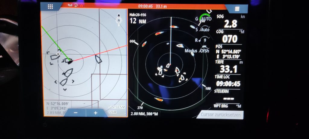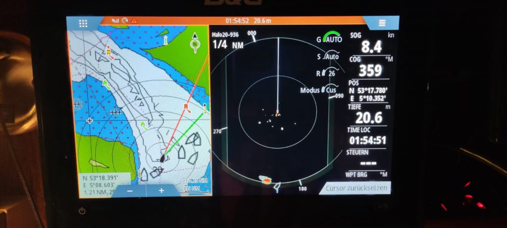 Mit der anbrechenden Donnerstagnacht, fahren wir auf das Jade-Weser-Elbe Einfahrtsgebiet zu. Das Radarbild wird bunter. Allerdings ist der dichte Zug aus Frachtschiffen am Horizont tatsächlich nur eine Reede voller ankernder Schiffe, durch die wir unbehindert durchfahren können. Es ist nun fast Hochwasser, die Weiterfahrt in die Weser ist bei dem starken Gegenstrom extrem langsam. Stundenlang kommen wir mit nur 2 Knoten über Grund voran und sind froh, als wir in Bremerhaven angekommen, wieder mit einlaufendem Wasser rechnen können.