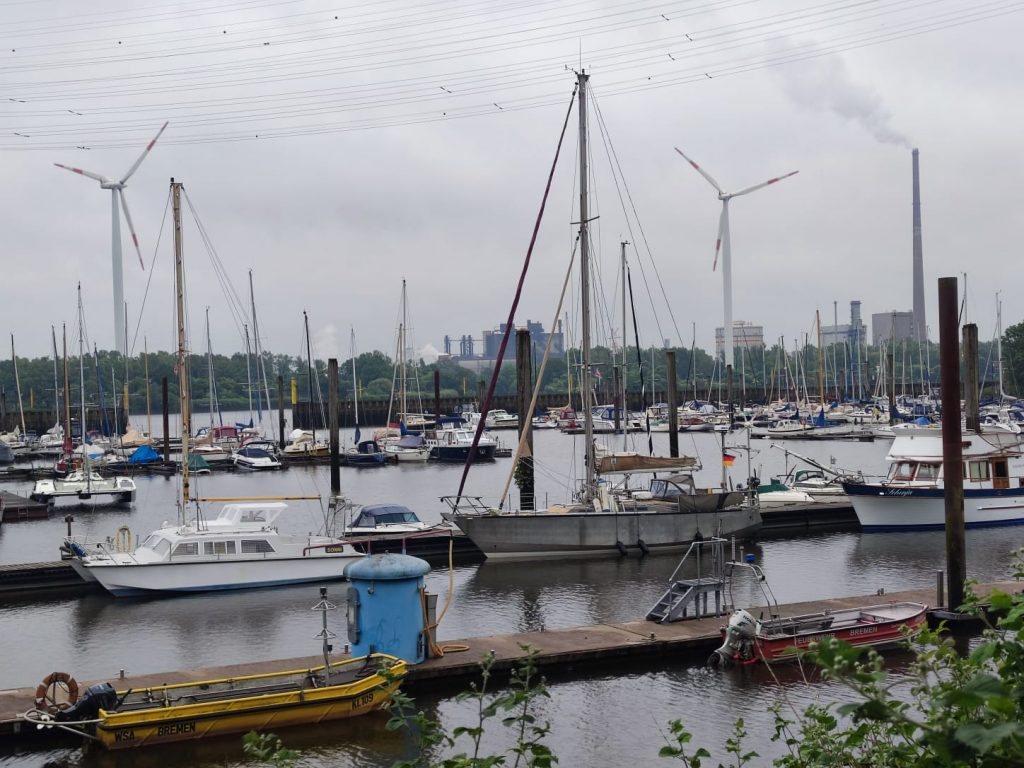 Nachdem wir die vielen großen Containerschiffe am Terminal bewundern konnten, geht es weiter die Weser hoch. Der Strom des einlaufenden Wassers addiert nun bis zu 2,6 Knoten zu unserer Geschwindigkeit. Wie angenommen, erreichen wir die letzte Weserkurve vor Hasenbüren gegen 15:00Uhr. In der letzten Weserkurve vor Hasenbüren dreht der Wind ein und wir können ein letztes Mal auf unserer Reise die Segel setzen.