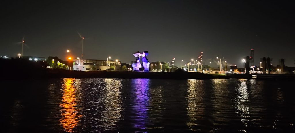 Zunächst haben wir keinen Strom. Später fliegen wir mit ca 7 Knoten die Priele hinunter. Der Wind weht in die gleiche Richtung wie das ablaufende Wasser, also alles gut. Das Watt vor dem Ijsselmeerdamm ist beleuchtet wie ein Christbaum. Das Navigieren ist kompliziert. Die Lichtsignale der Tonnenpärchen, die das Fahrwasser begrenzen, sind nur schwer zu unterscheiden. Zu zweit, mit verschobenen Wachzeiten, schaffen wir die Ausfahrt in der Nacht über das Gatt in die Nordsee in Terschelling dann in Rekordgeschwindigkeit.
