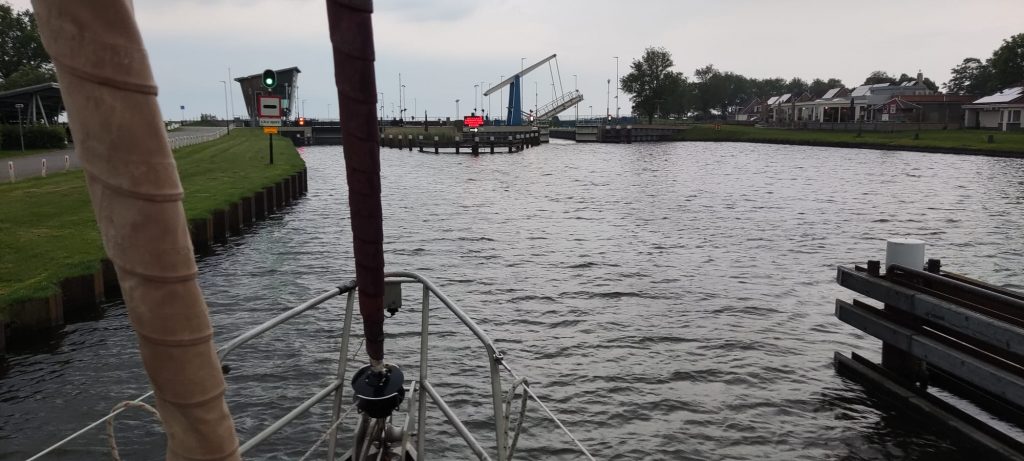 Wir sind entthäuscht und stellen uns auf eine deutlich verspätete Ankunft in Bremen ein. Es hilft nichts – wir müssen umdrehen, nach Sneek zurück und dann über das Hegemer Mar nach Stavoren wieder ins Ijsselmeer. Auf diesem Weg gibt es lediglich eine Brücke und eine Schleuse. Allerdings wird die Schleuse in Stavoren nur bis 20:00 betrieben. Mit erhöhter Motordrehzahl und dem Glück einer direkten Brückenöffnung schaffen wir es gerade bis 10 vor acht an der Schleuse zu sein. Das Signallicht wird grün und wir können einfahren. Wir sind heute das letzte Boot. Nach uns macht die Schleusencrew Feierabend. Ein deutsches Segelboot auf der Ijsselmeerseite muß wieder abdrehen.