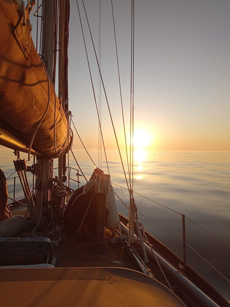 Manchmal steht die Sun fast ohne Fahrt und manchmal macht sie mehr als 7 Knoten. Der Strom und der unbeständige Nordwestwind machen uns zu schaffen. Mal ist eine zusätzliche AIS- und Radarwache notwendig, mal werden alle Hände an Deck benötigt, um zu Reffen oder Segel zu setzen. Immer wieder werden wir in das stark befahrene Verkehrstrennungsgebiet versetzt. Wir treffen auf Windparks, die selbst in den nagelneuen Papierkarten nicht eingezeichnet sind.