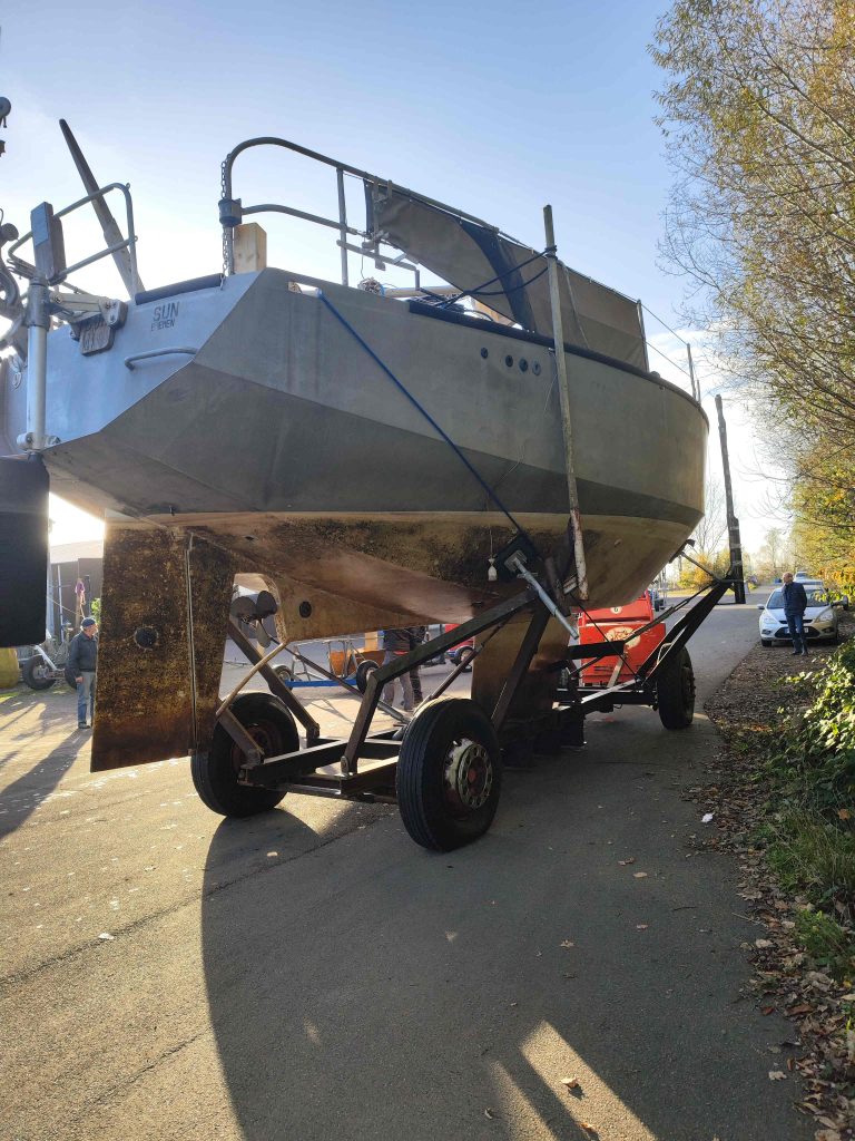 Das erste Arbeitswochenende ging zuende und ich ging davon aus, dass die Arbeiten am Wagen nun zuende seien. Ich frage nochmals die Experten aus dem Club und bekomme noch einige Hinweise. So wäre es besser Hinten nur eine Runge zu haben – man könnte dann das Boot an der verbleibenden Runge befestigen und das Kippmoment in der Phase, wenn die Palle noch nicht befestigt sind damit abfangen, da die vorderen Rungen durch die Bewegung des Bootes auf den Winkel der Slipbahn, nicht mehr am Rumpf anliegen würden. Nach einer fast schlaflosen Nacht, habe ich mich entschlossen den Freitag vor dem Sliptermin frei zu nehmen und die Ratschläge in die Realität zu bringen. Also bin ich ganz früh auf dem Hof in Hasenbüren und flexe und schweiße den ganzen Tag. Die vorderen oberen Rungenteile werden verstärkt – zusätzlich zu dem ursprünglichen Rohr kommt eine U-Schiene als Versteifung hinzu, im unteren Teil wird ein Teil der ursprünglich längeren Rungen eingesetzt. Der Ansatz der hinteren Rungen wird nochmals überschweißt um das ganze zu stabilisieren. Dann wird die hintere Runge nachgestellt. So daß die auf Stb genau so steht wie das Schiff stehen muß. Die auf Bb wird nach außen eingestellt, so daß die breiteste Stelle der Sun in jedem Fall bei der Einfahrt durchpaßt. Als es dunkel wird, kann ich die Arbeit beschließen und mich geistig auf den nächsten Tag mit dem Sliptermin vorbereiten. Da es das erste Mal in Hasenbüren – und dann mit einem neuen angepaßten Wagen ist – fühle ich mich recht unsicher, und denke mir lauter Alternativszenarien für den Fall aus, daß das Slippen nicht funktioniert.
